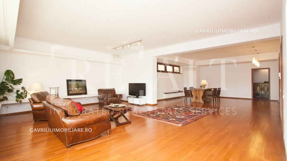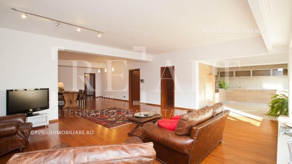 Proprietatea este situata la etajul 1 al unui imobil finalizat in anul 2008, structurat pe subsol, parter si 5 etaje! Aceasta masoara o suprafata utila de 171mp si este compus din: living (78mp), bucatarie semi-deschisa (23mp), o terasa superba de peste 16mp si un grup sanitar, toate formand zona de zi, in timp ce zona de relaxare cuprinde: un dormitor cu baie proprie si dressing (cu suprafata cumulata de 30mp), al doilea dormitor cu baie si dressing (cu suprafata cumulata de peste 23mp) si balcon de 4mp.